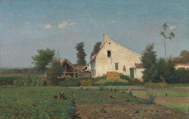 Gabriël werkte heel precies in dit schilderij van een boerderij in de buurt van Brussel. Bijna iedere baksteen in het versleten pleisterwerk van de muur gaf hij afzonderlijk aan.