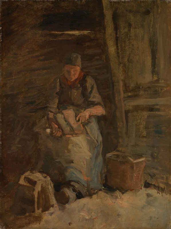 De vrouw is schetsmatig weergegeven. Hendrik Willem Mesdag was dol op schetsmatig werk en kocht het schilderij rond 1893.