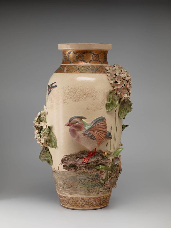 Vaas met reliëfdecor van hortensia's en watervogels