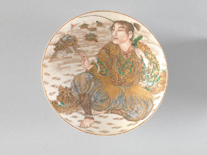 Schaal met decor van zittende Ōta Dōkan en kasteeltorens in de achtergrond