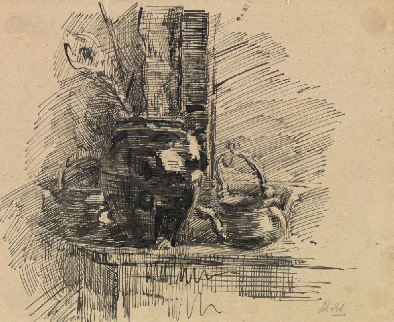 Stilleven met vaas, lavabo en pot